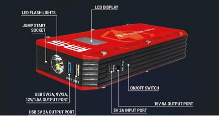 Die Power Box PB-02 ist eine perfekte Notstromlösung, die 1200A für Starthilfe bei Fahrzeugen (Motorräder, Autos, Boote und mehr...) liefert, USB-Geräte (Smartphones, Tablets...) auflädt und eine Notbeleuchtung bietet.